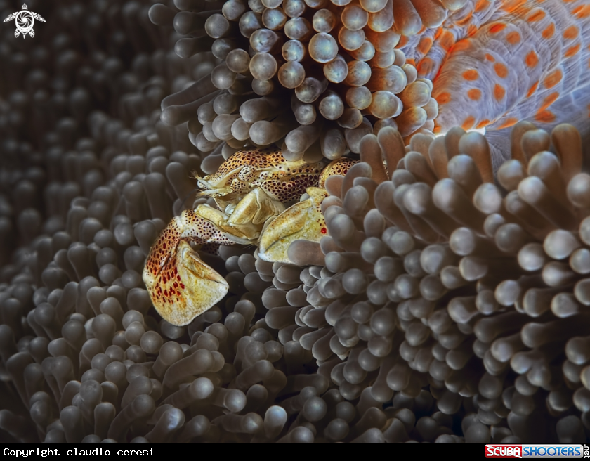 Common Name Porcellain crab over golden anemone