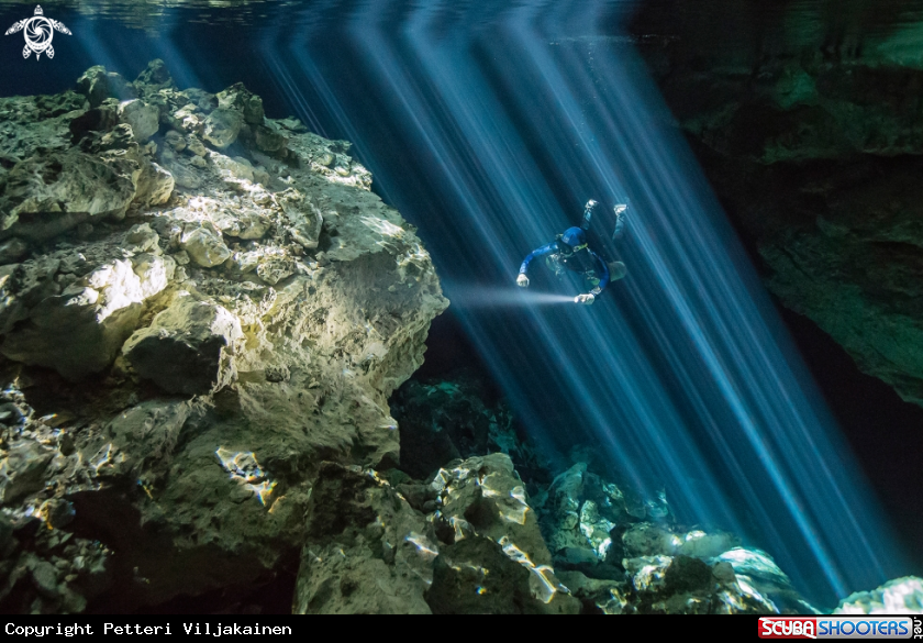 Common Name Diver inside light beams