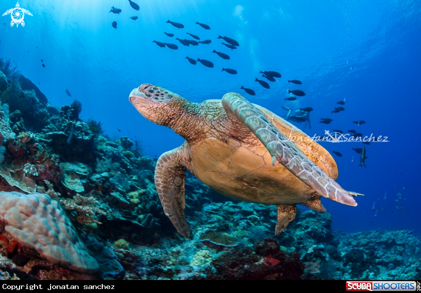 Common Name Green turtle gliding on the reef