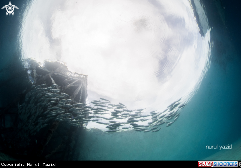 Common Name Schooling jacks under a jetty