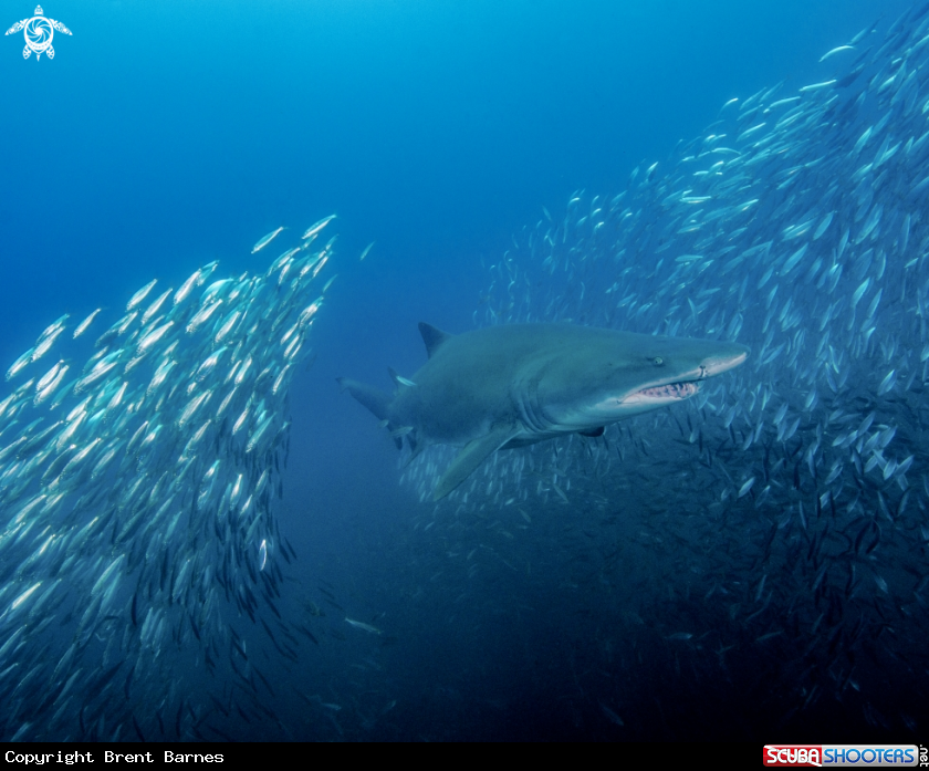 Sand Tiger Shark Bursting Through a School of Minnows | Brent Barnes's Photo