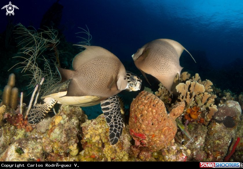 Common Name Hawksbill and two grey angelfish feeding on a sponge