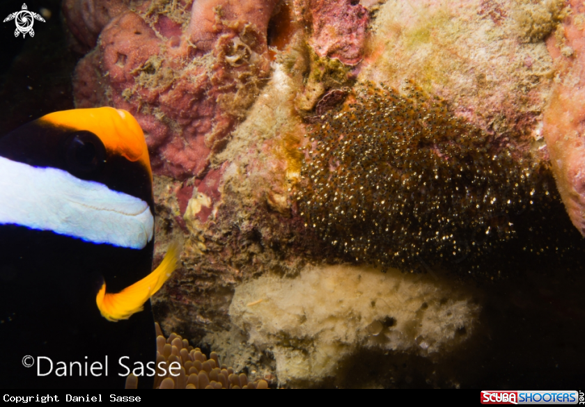 Parental behaviour of a Clarks Anemonefish waving fresh oxygenated water towards its eggs. | Daniel Sasse's Photo