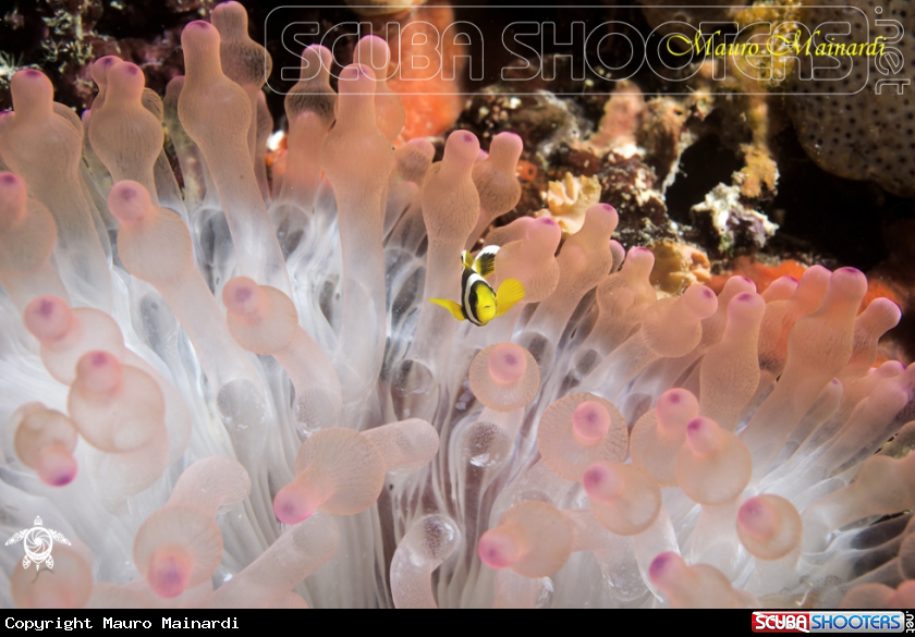 Common Name Baby Clownfish and young anemone