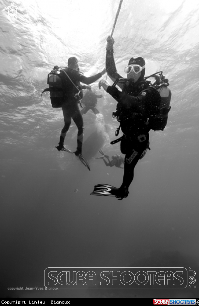 Common Name Divers on a deco stop with moderatre currents .Balaclava,Mauritius