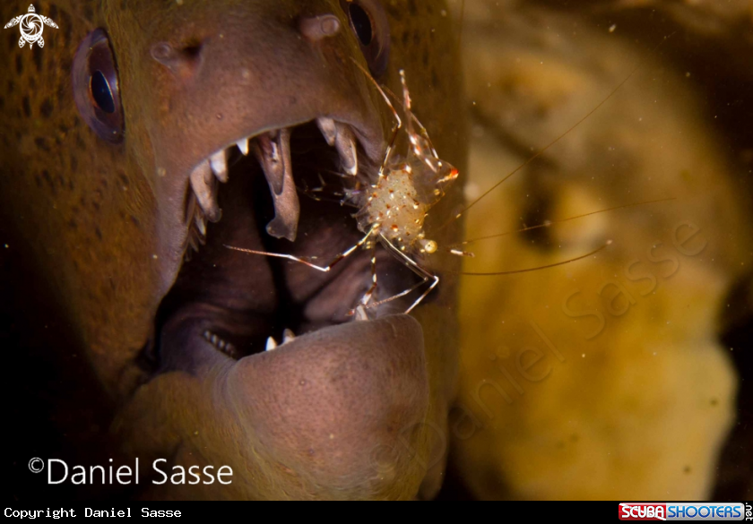 Common Name Transparent Cleaner Shrimp pregnant and Giant Moray