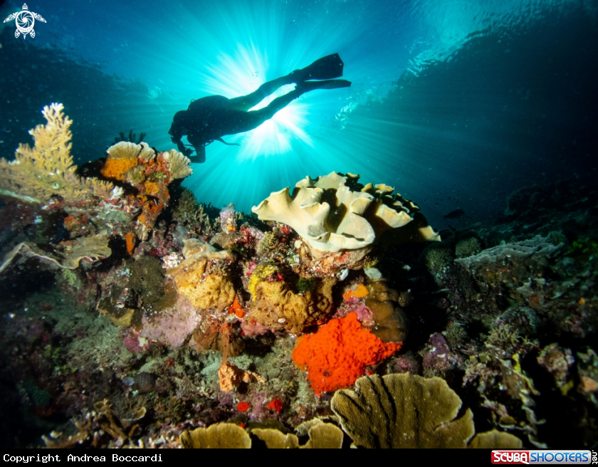 Common Name Diver over corals