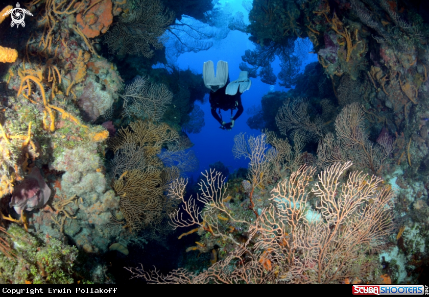Sea fans bracketing Cozumel swimthrough | Erwin Poliakoff's Photo