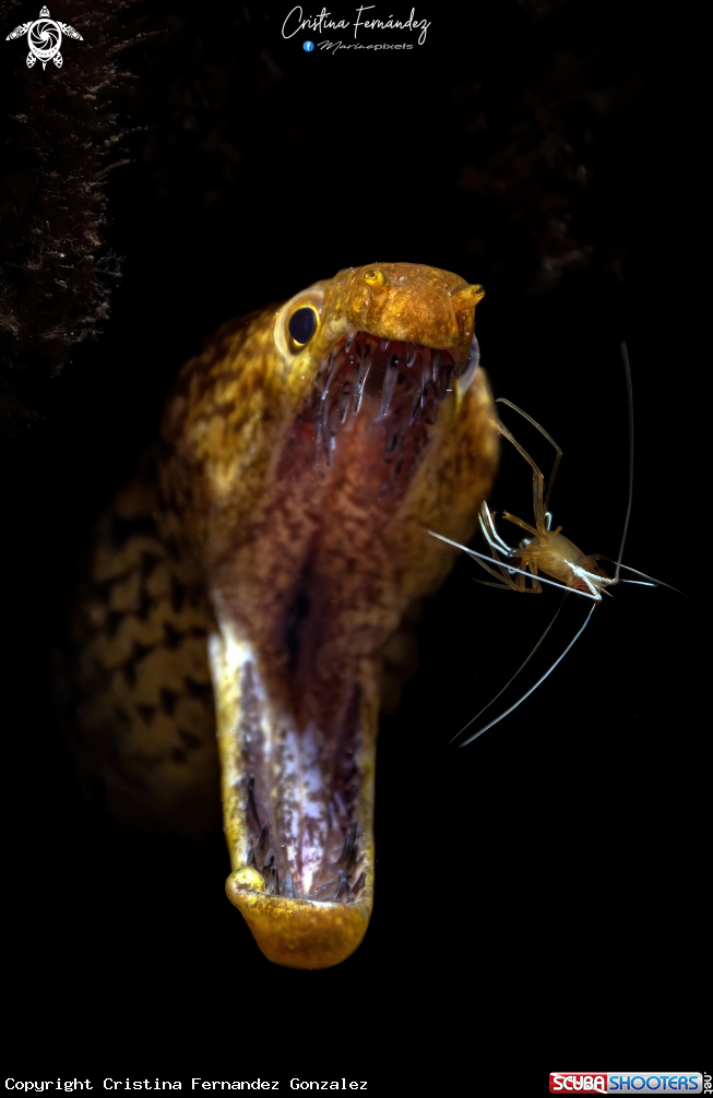 Common Name Fangtooth moray - White striped cleaner shrimp