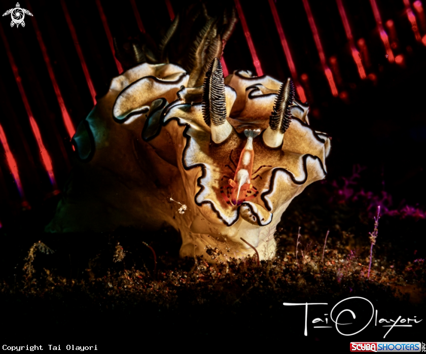 Common Name Emperor shrimp (Periclimenes imperator) on a Black-margined Nudibranch (Doriprismatica atromarginata).