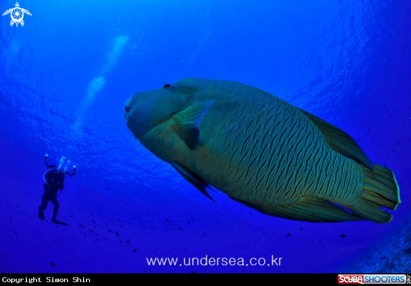 Green humphead parrotfish & diver | Simon Shin's Photo