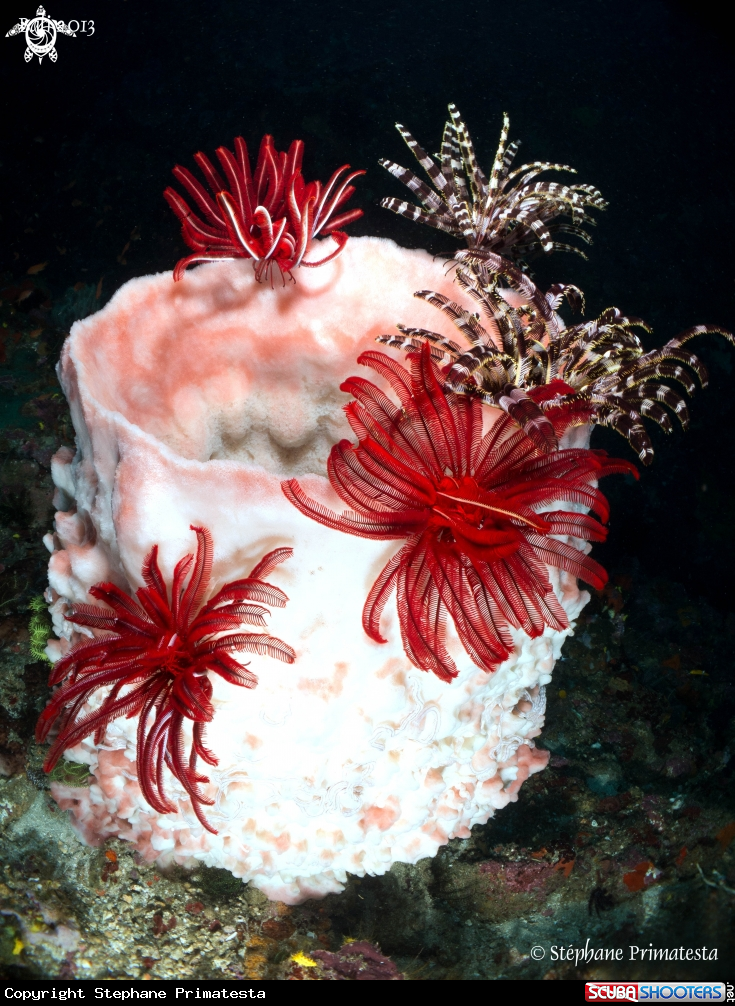 Common Name Barrel sponge with crinoids