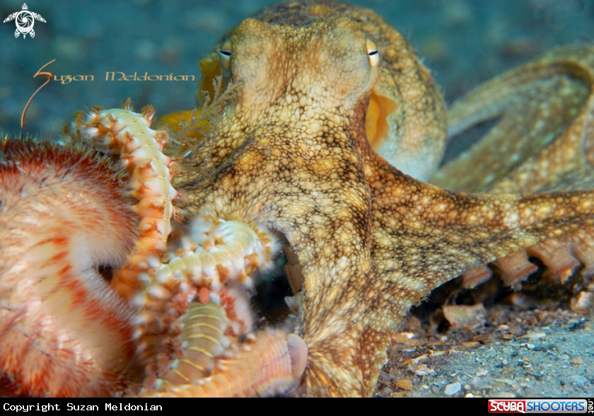 Common Name Octopus being taken down by fireworms while alive
