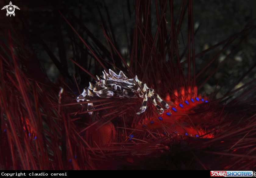 Scientific Name granchio zebra (Zebrida adamsii) over the (Asthenosoma barium)