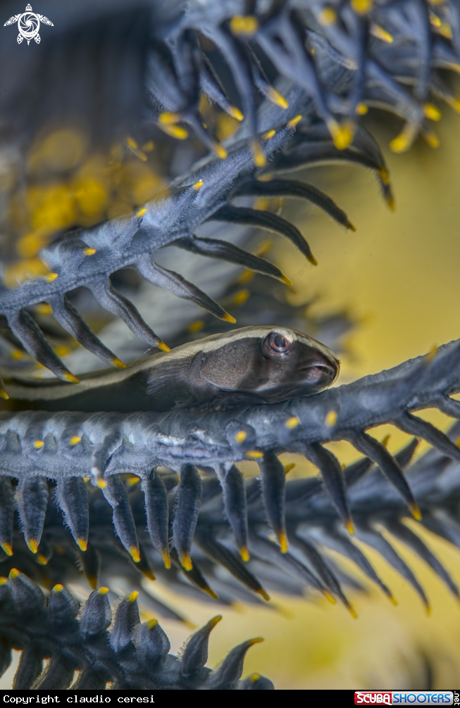 Common Name Brittlestar diner on a Dendronephthya, Fish Sniffer crinoid (Crinoid cling fish).