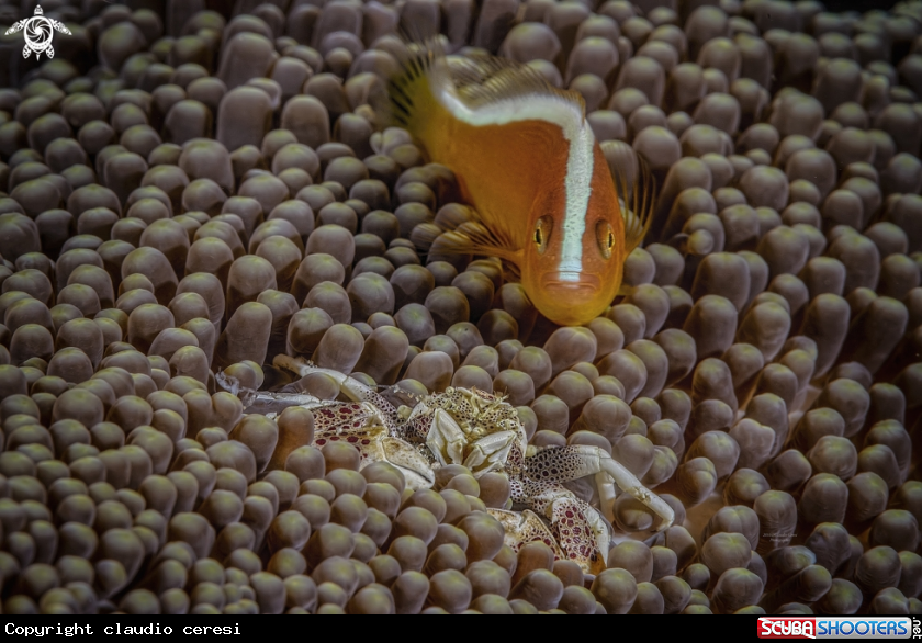Common Name porcellain crab & clownfish over anemone