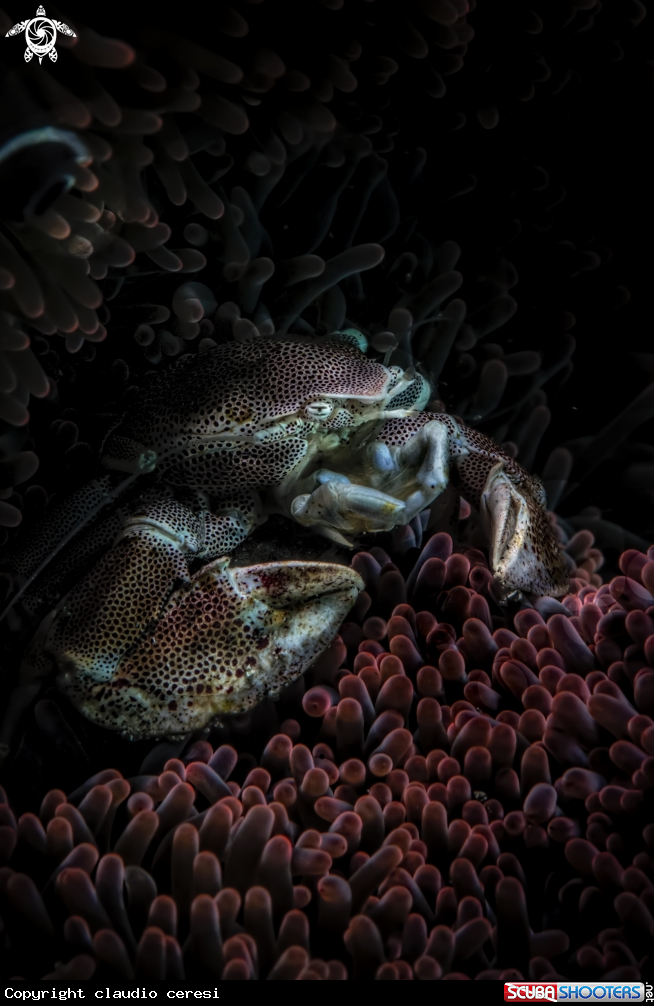 Common Name Porcellain crab over red anemone