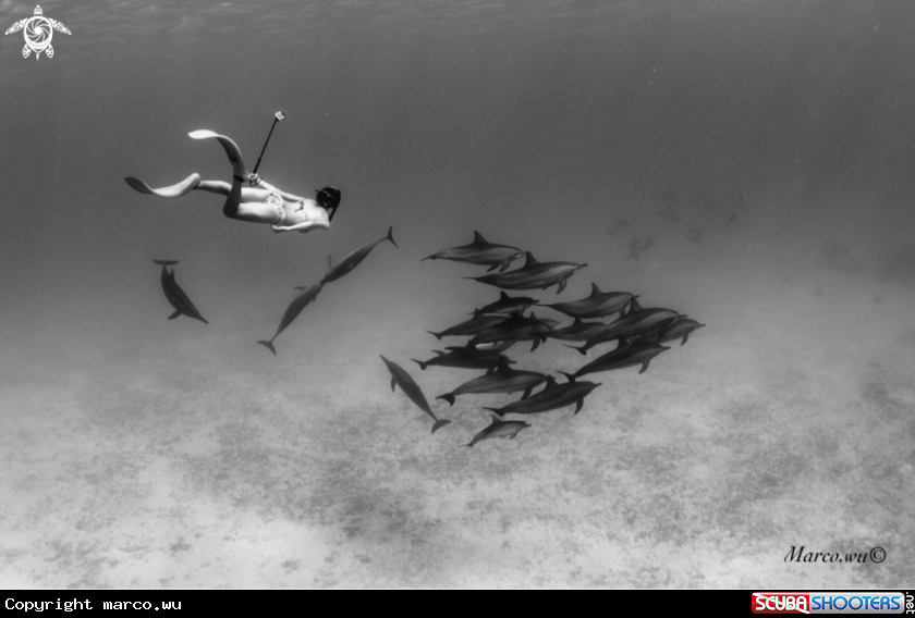 Common Name Freediving girl with dolphin famliy