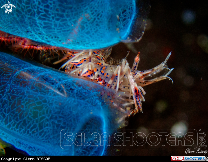 Spiny Tiger shrimp on blue Rhopalaea | Glenn BISCOP's Photo