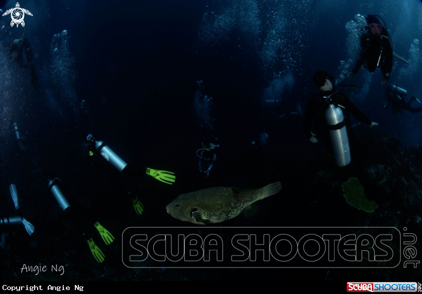 Surrounded by divers,this puffer fish reminds us that even the smallest creatures can steal the spotlight. | Angie Ng's Photo